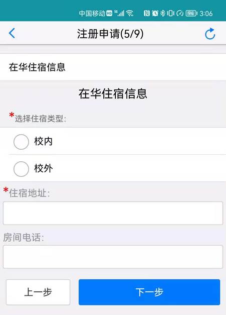 ● 填写在华住宿信息:校内或校外详细地址。点击“下一步”。