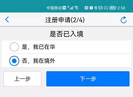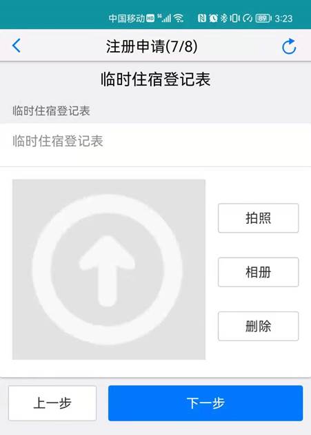 ● 如在中国境内,上传临时住宿登记表。点击“下一步”。