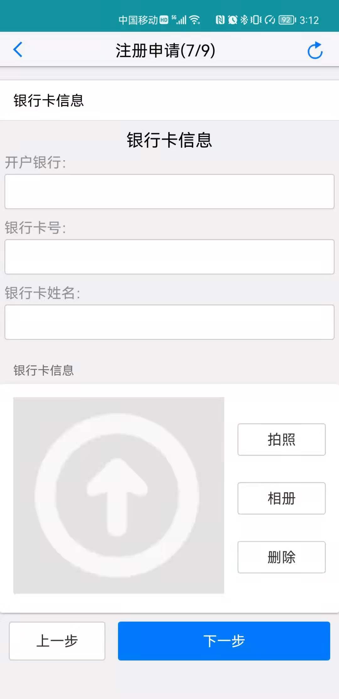 ● 如为中国境内的中国政府奖学金生,或有生活费的其它奖学金生填写银行卡信息:开户银行、卡号、姓名、银行卡照片。点击“下一步”。