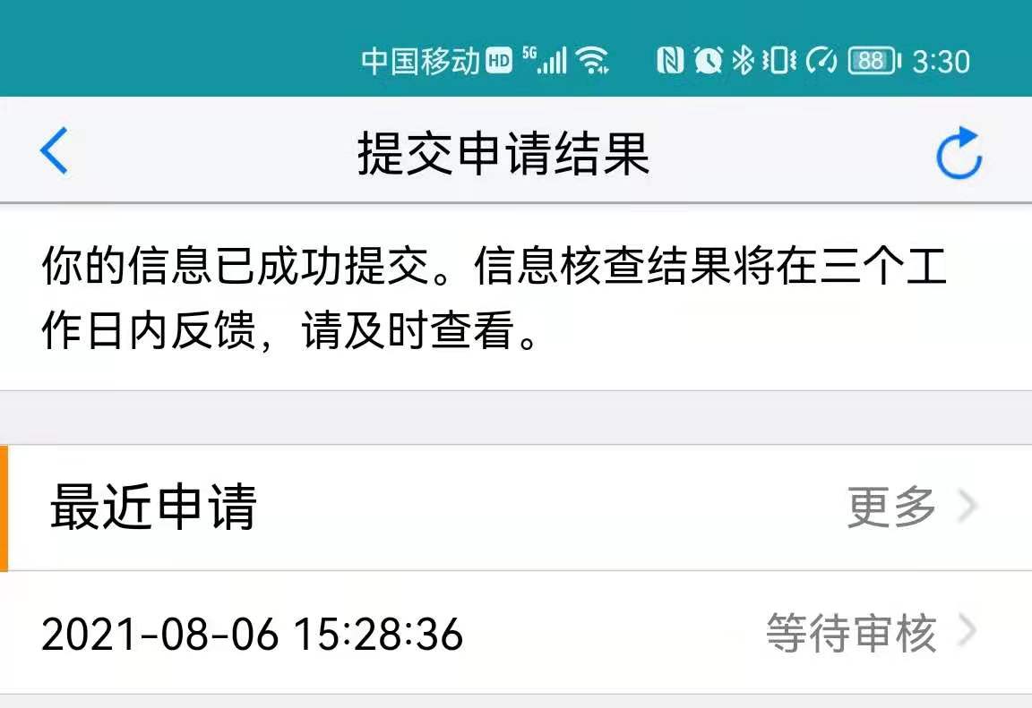 ● 成功提交后,后出现以下提示信息。学校会在三个工作日内反馈审核结果,请注意查看。