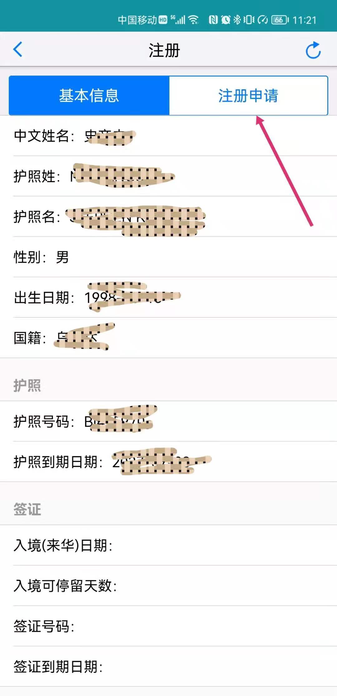 ● 在APP主页上,点击“注册”,在出现的页面上核实个人信息,并在点击右上角的“注册申请”。