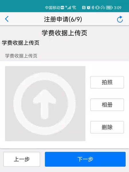 ● 从相册选择学费收据照片上传,或者直接拍照上传(中国政府奖学金生或免学费学生会直接跳过这一步)。然后点击“下一步”。