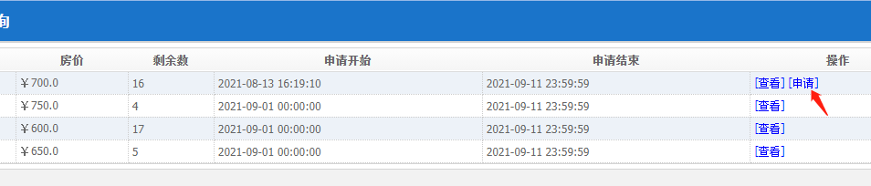 4、选择合适的房间,点击操作部分的“申请”。
