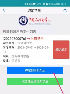 l 登陆后会显示系统中已经绑定的学生信息。如果以前曾在我校就读,会出现多条信息,选择本次要注册的学生身份。然后点击“绑定到手机APP”。